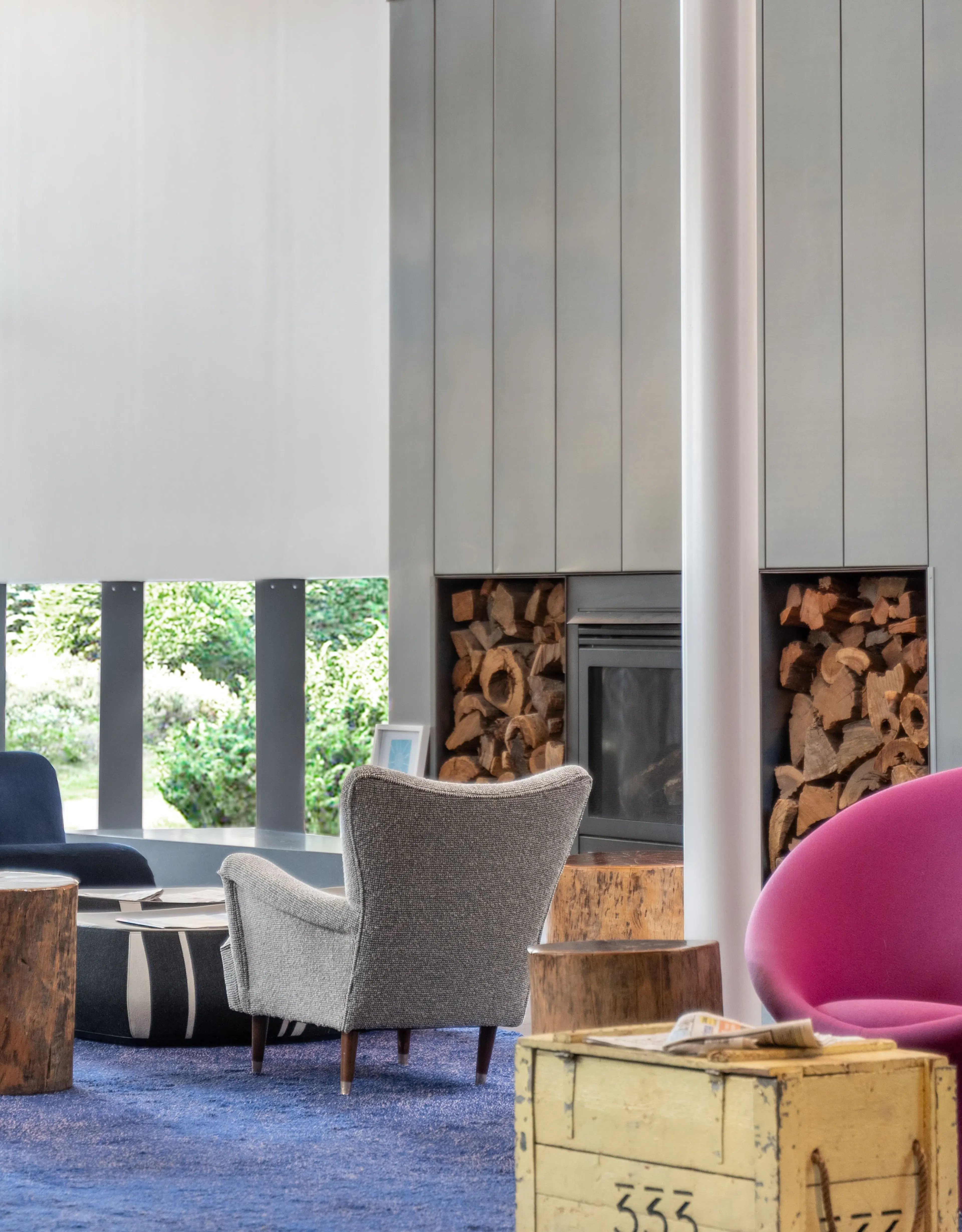 Peppers Gallery Hotel reception is open 24 hours and overlooks a garden courtyard with lounge seating and fireplace.